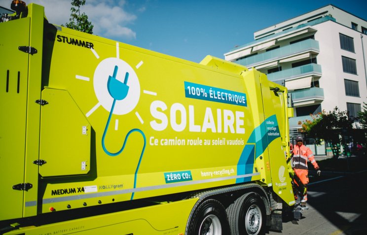 Les deux camions 100% électriques acquis par l'entreprise Henry Transports à l'automne 2020 seront ravitaillés par l'énergie produite localement sur les toits de notre entreprise à Vufflens-la-Ville.